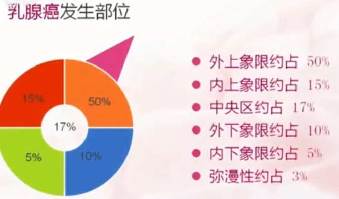 超聲影像最終的目的是要找出乳腺癌,做乳腺檢查的人絡繹不絕。那什么是乳腺癌呢?它有什么危害呢?乳腺癌是指發生于導管上皮,及末梢導管上皮的惡性腫瘤。乳腺癌的危害,一是致殘摧毀女性的自信。二是發病率及死亡率在所有惡性腫瘤中排名第一。對家庭的危害極大,婦女能頂半邊天,半邊天沒有了,這個家就相當于塌了一半。乳腺癌的常見發生部位,外上象限約占50%,內上象限約占15%,中央區約占17%,外下象限約占10%,內下象限約占5%,彌漫性約占3%。乳腺癌術后5年生存率一期:80-90%,二期:60-70%,三期:40%。因此 提高乳腺癌生存率和降低死亡率的關鍵在于早發現早診斷早治療。