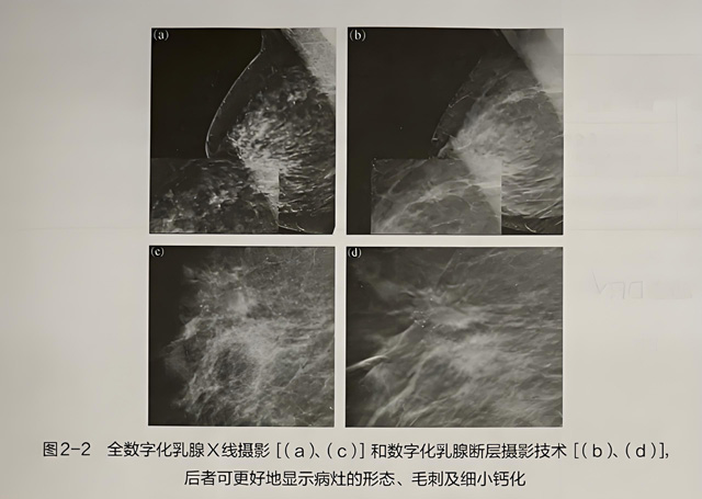 DBT是一種以乳腺X線攝影技術(shù)為基礎(chǔ)的三維成像技術(shù),可減少組織重疊對診斷準(zhǔn)確性的干擾。DBT通過圍繞乳腺弧形旋轉(zhuǎn)的X線球管多角度曝光,獲得乳腺在不同角度下的影像,然后根據(jù)組織體積將其重建成一系列高分辨率的體層影像。 每層約1mm厚的組織位于焦點上,其上面或下面的組織顯示于焦點外,以減少重疊組織的成像。DBT在乳腺疾病中的優(yōu)勢:①克服傳統(tǒng)二維圖像組織重疊的影響:②對病灶邊緣顯示更清楚;③對一些細(xì)小鈣化顯示更清楚:④提高乳腺疾病診斷的準(zhǔn)確率(圖2-2)。
